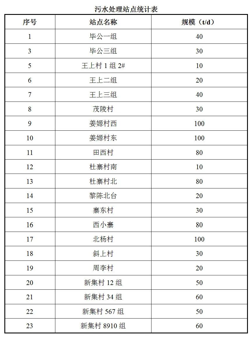 项目已建成23座集中式污水处理站,总设计处理规模1090t/d。各站点情况见下表: