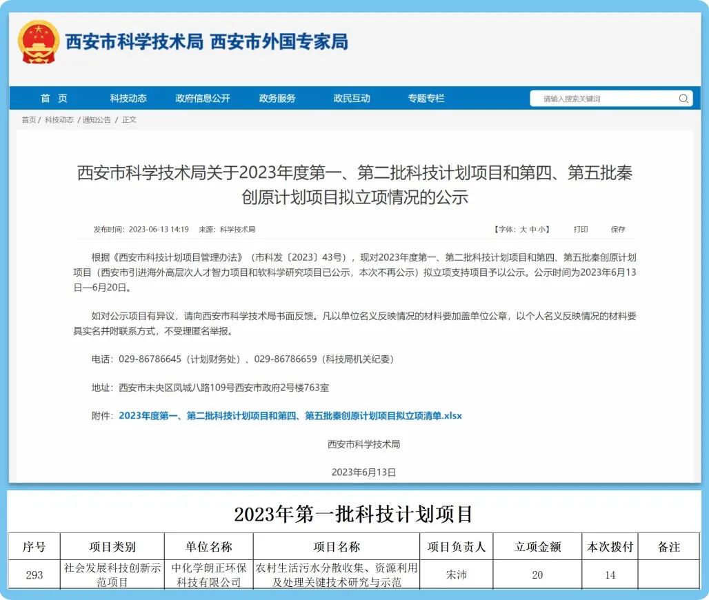 由中化学朗正环保科技有限公司申报的《农村生活污水分散收集、资源利用及处理关键技术研究与示范》项目荣获2023年度西安市科技计划项目(第一批)-社会发展科技创新示范项目立项。
